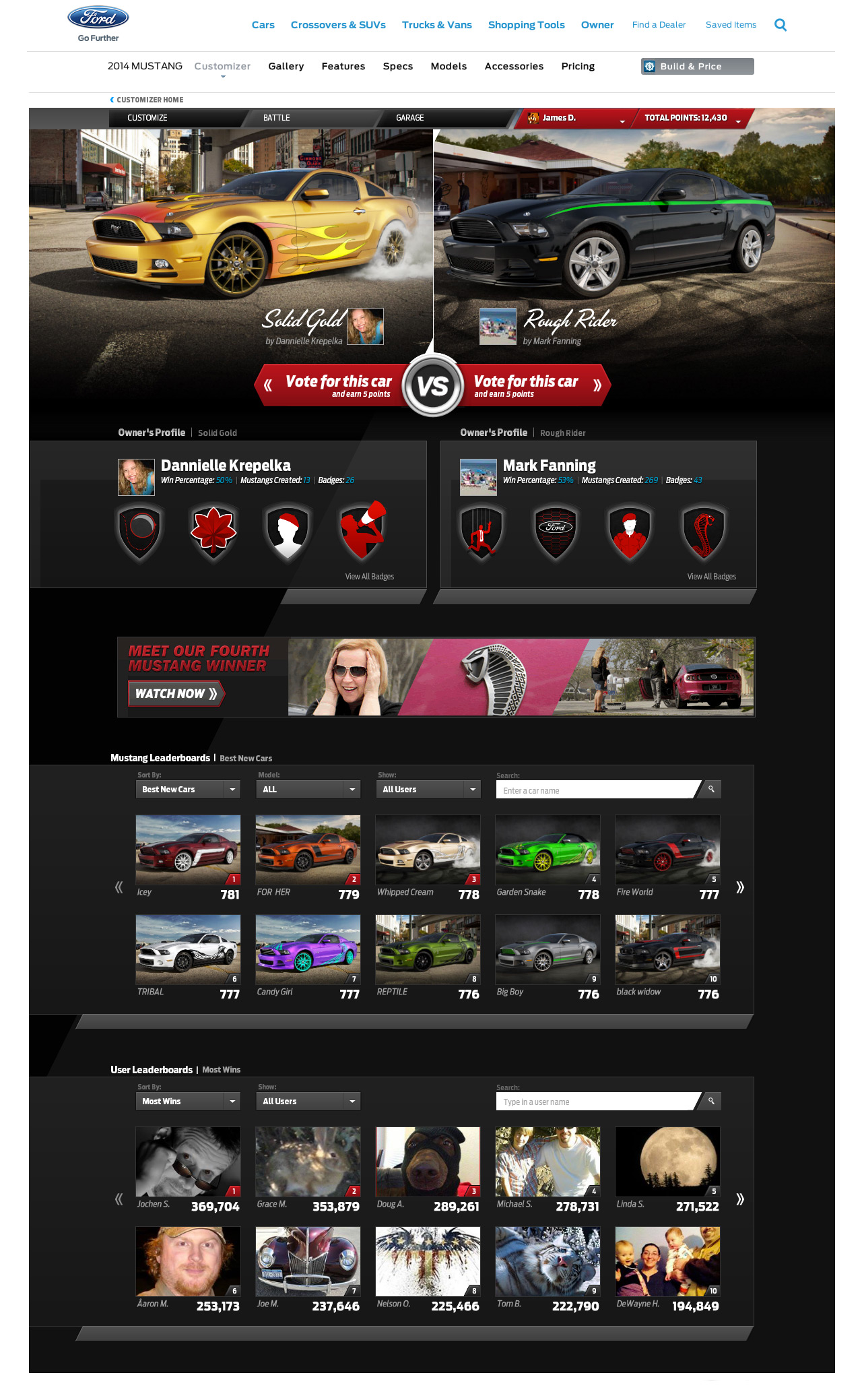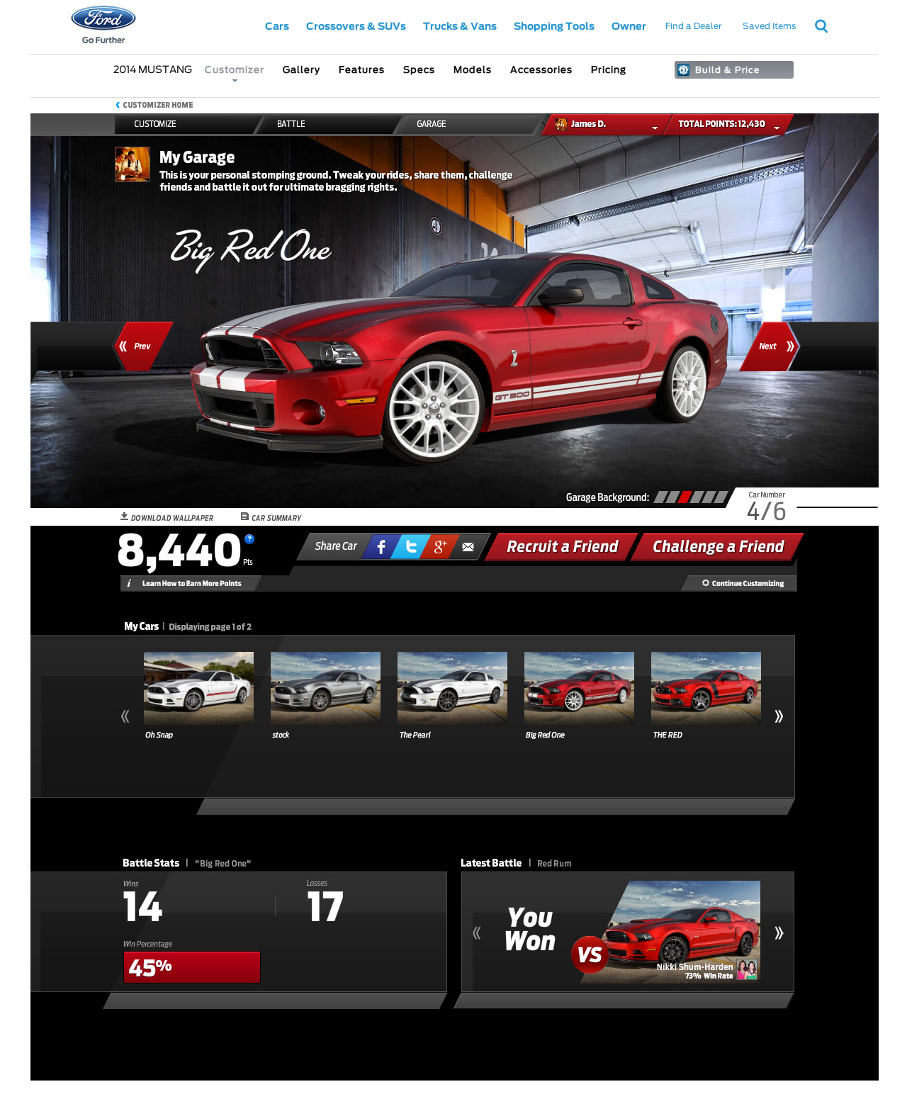 Updating the Ford Mustang Customizr was no short task. The 2014 version was a complete rebuild from previous years. Working with Team Detroit, we were able to create a new battle system that implemented scoring, leaderboards, badges, Facebook Connect and the ability to challenge your friends. User's were able to create multiple custom cars using three base models and hundreds of different parts.